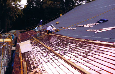 銅は、銅屋根として、耐久性があり、細工が利き自由な曲面で葺けるため社寺伝統建築ではよく用いられます。